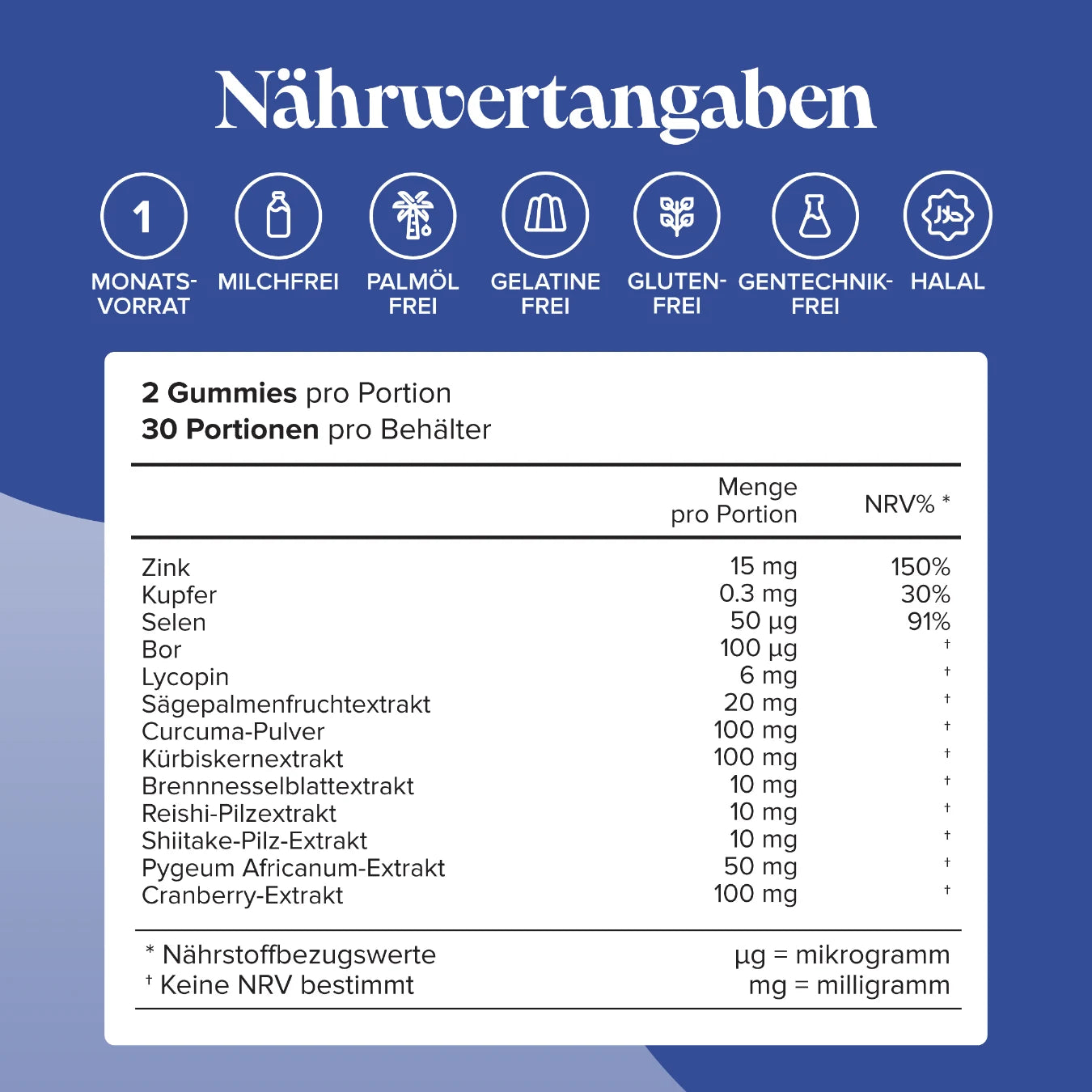 Ab dem Alter von 40 Jahren können bei Männern bedeutende Veränderungen von Biomarkern auftreten, insbesondere ein Rückgang der Testosteronwerte, erhöhte Entzündungsmarker sowie mögliche Veränderungen von Blutdruck und Lipidprofilen. Unser Set besteht aus wichtigen Vitaminen, Mineralstoffen und Pflanzenextrakten, die jeweils eine gezielte Rolle bei der Unterstützung der männlichen Gesundheit und des allgemeinen Wohlbefindens spielen.