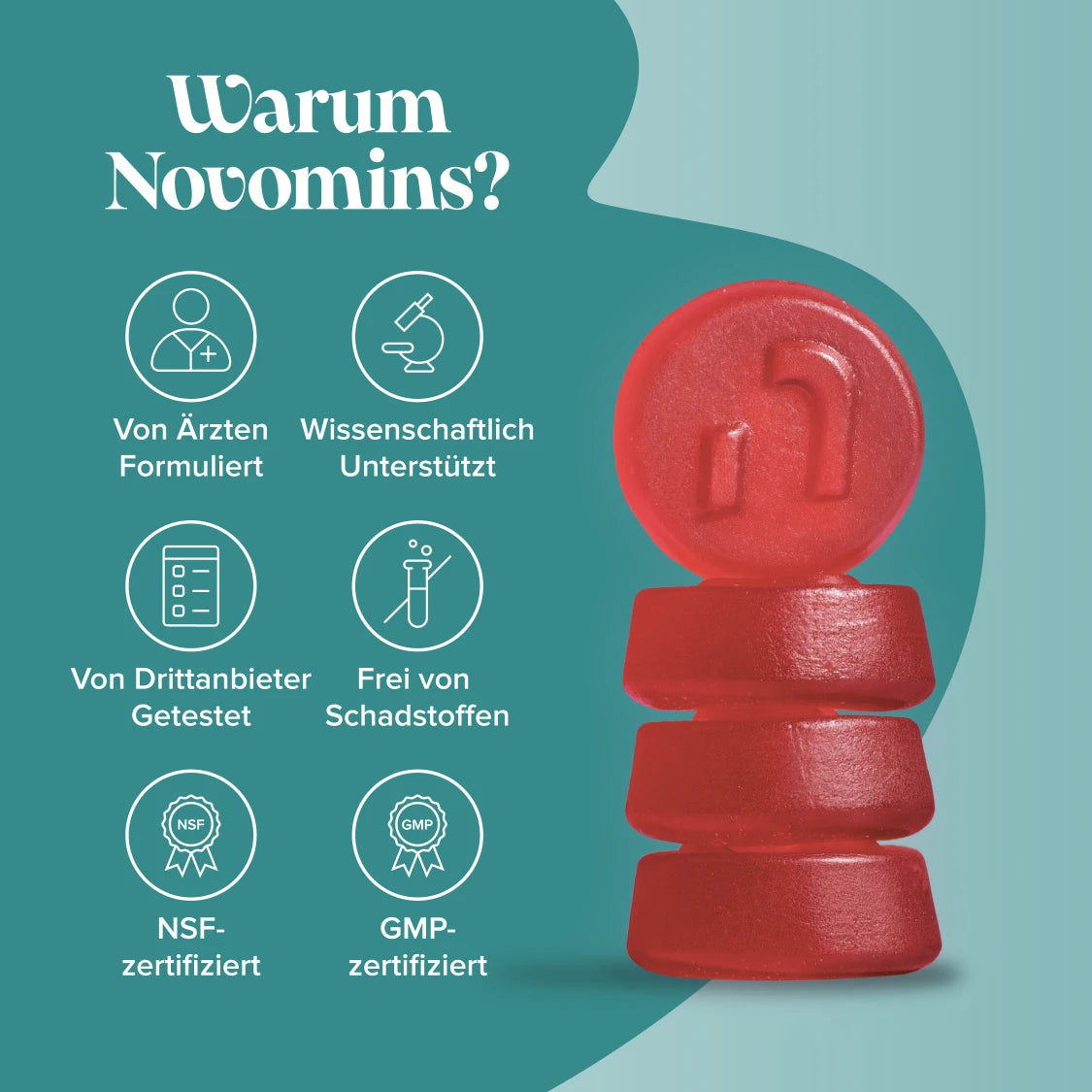 Novomins-Gummies sind nicht nur lecker, sie basieren auf ernsthafter Wissenschaft. Wir füllen jedes Gummi mit hochwertigen, wissenschaftlich fundierten Zutaten, die Ihr Körper genau weiß, wie er sie nutzt. Kein Schnickschnack, keine Füllstoffe, nur fachmännisch formulierte Unterstützung, die tatsächlich aufgenommen wird. Denn Sie müssen kein Biochemiker sein, um eine bessere Ernährung zu erreichen, Sie brauchen einfach bessere Gummies.