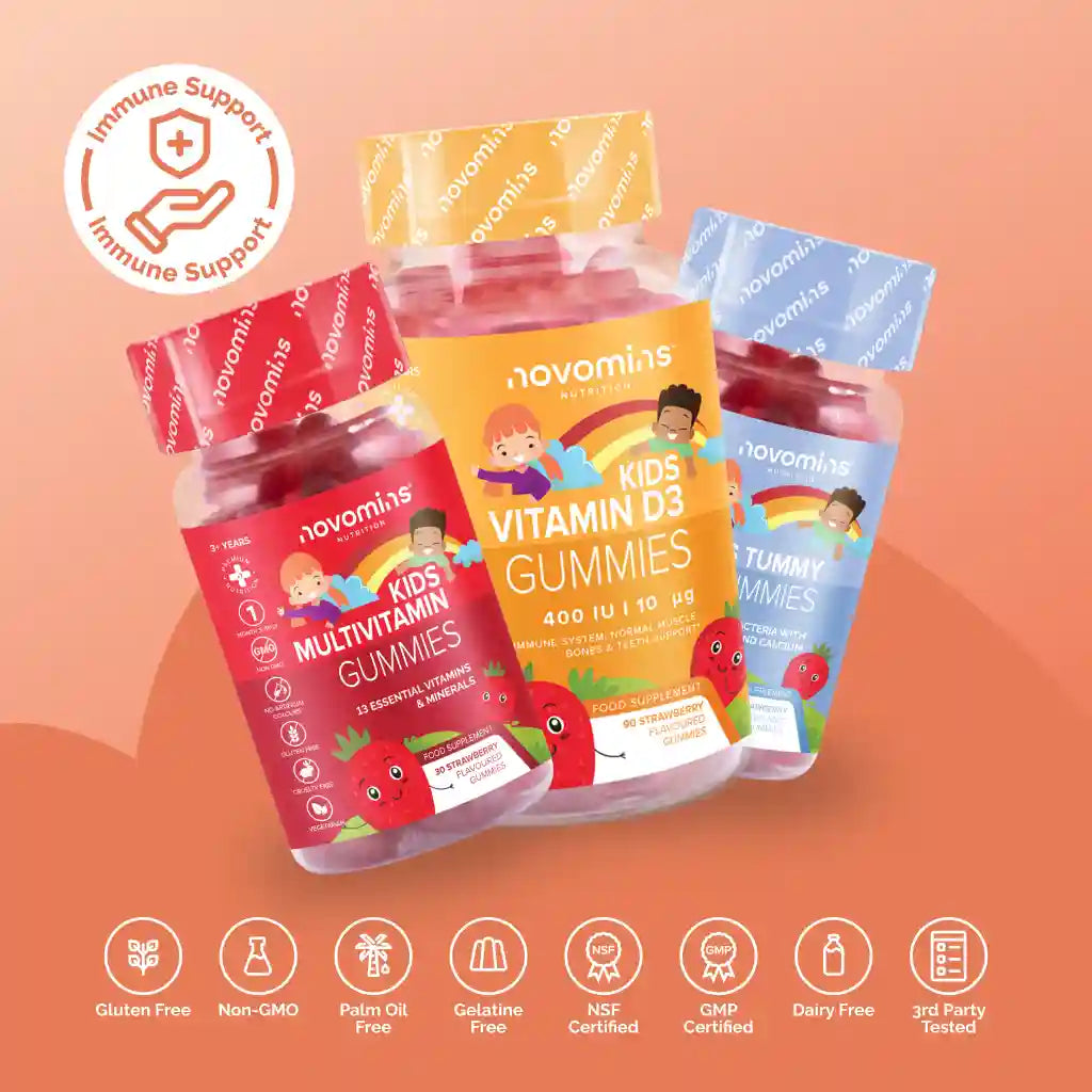 Support your child's immune system and overall well-being with the Novomins Kids Immunity Bundle. Expertly formulated with essential vitamins and minerals, including a Kids Multivitamin, Vitamin D, and Tummy Gummies, it contributes to normal immune function, bone health, and energy levels, helping them stay strong and healthy every day.