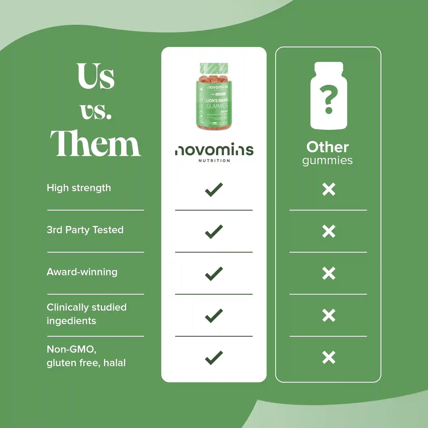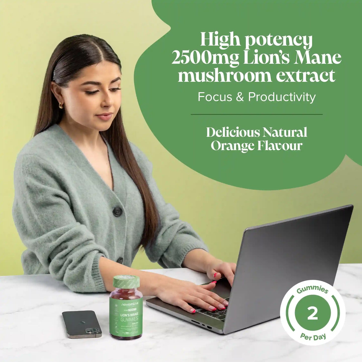 Novomins Lion's Mane Gummies are formulated with a high-strength extract of Lion’s Mane mushroom (Hericium erinaceus), which is long prized for its traditional use in supporting mental clarity and brain function. We've paired it with vitamin B6 and B12 to support the nervous system, psychological function, and help reduce tiredness and iodine for cognitive function.