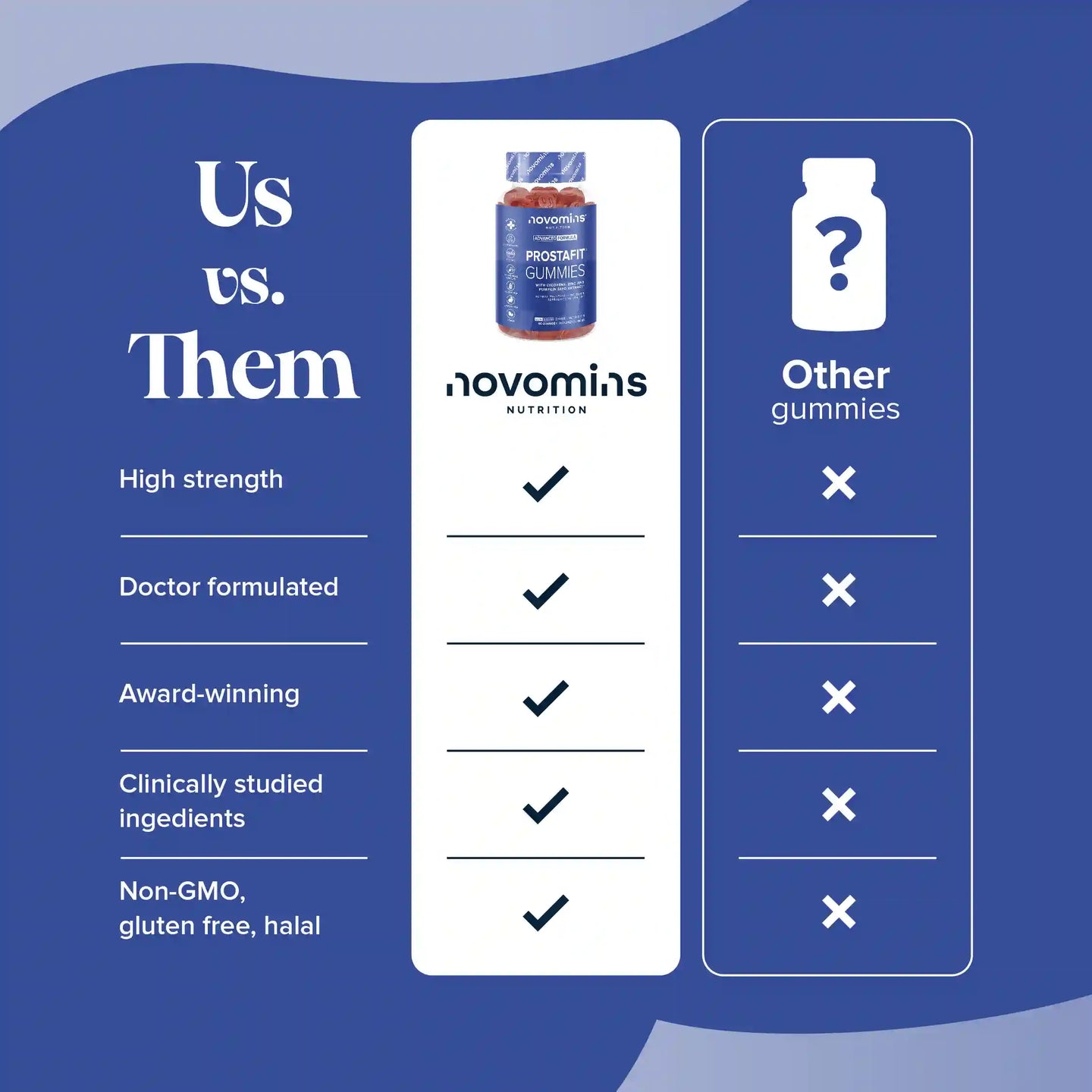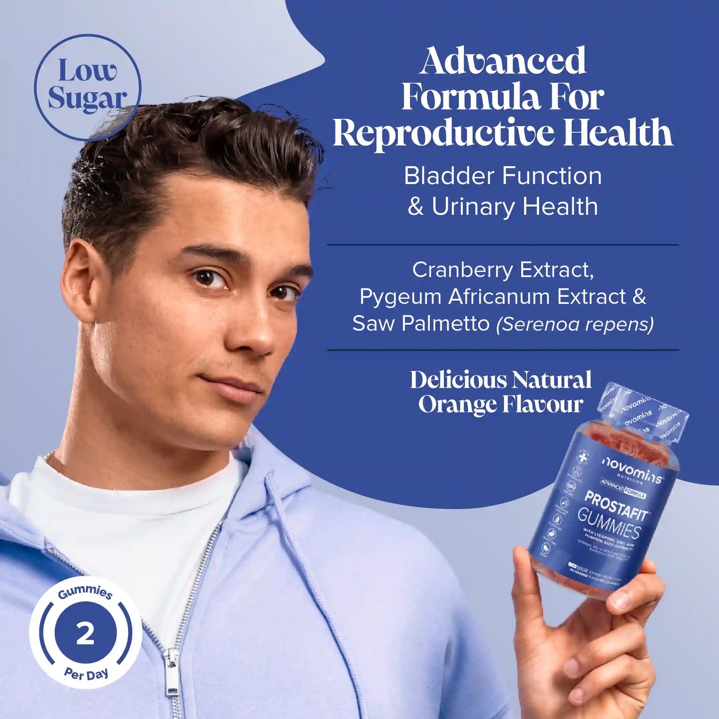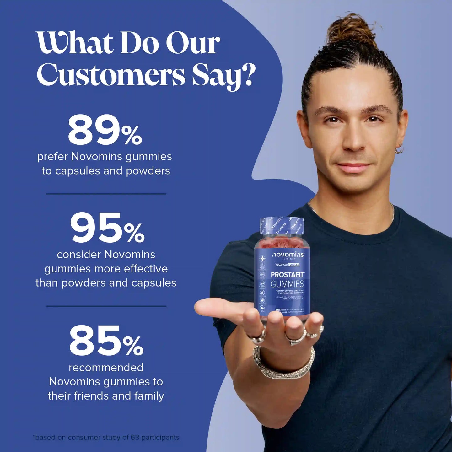 Novomins Prostate Gummies are expertly formulated for men with added nettle leaf, pumpkin seed, turmeric, zinc and selenium and cranberry extracts, because you deserve a formulation that's both natural and advanced.